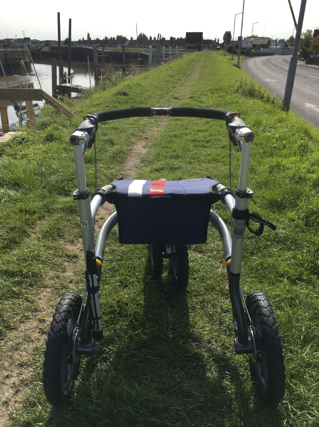 I have tested the Veloped on different terrain and it makes short work of everything I have tried. Gravel pathways, which are supposed to be “wheelchair friendly* (Veloped is not a wheelchair of course), are not a problem with such large wheels. Smooth and rough grass and fields are fun to walk through. I have yet to try cobbles but I know where I can find some to test. Shingle pathways and soft sand are no obstacles. I have walked in the woods and the riverbank – photos of the terrain are attached! So, I go out for my daily walk with my camera equipment in the basket to the local quayside, sit on my Veloped, and take pictures of the fishing boats.