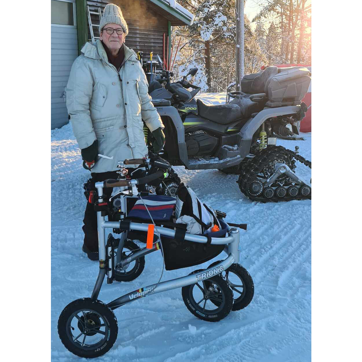 Thanks to its 3-wheeler design, the patented climbing wheel and considerably bigger wheels, the Veloped is the only truly off-road capable walker/rollator in the world. When walking on uneven and rough ground, the Veloped beats any rollator, every time.